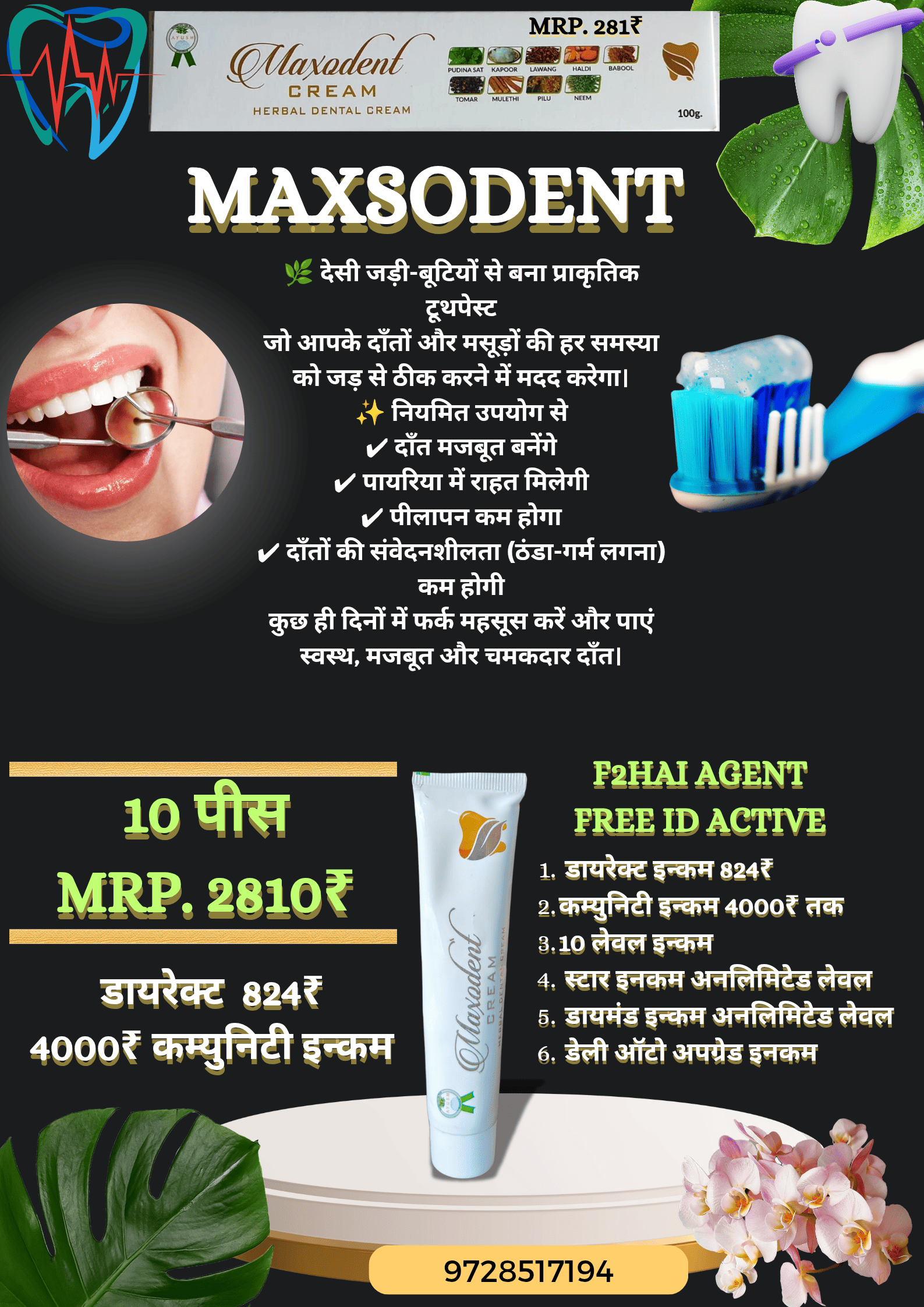 MAXSODENT TOOTHPASTE 10 pis order dene par 2060? ki ID free Active 4000? Tak Non Working income + 824? Direct Income +Level Income +Auto Upgrade Income