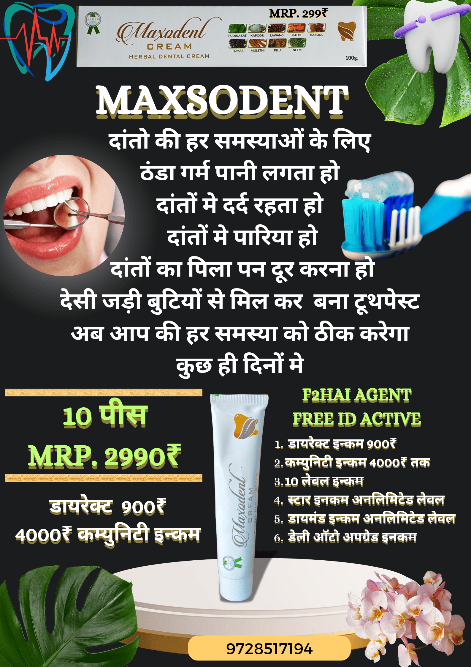 MAXSODENT TOOTHPASTE 10 pis order dene par 2250? ki ID free Active 4000? Tak Non Working income + 900? Direct Income +Level Income +Auto Upgrade Income